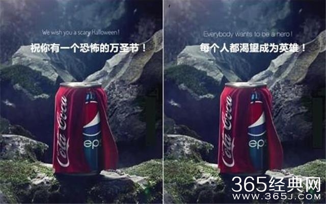 百事可乐:百事可乐在万圣节的时候做了左边的这张海报,上面写着“祝你有一个恐怖的万圣节!”意思是说,我可以披着可口可乐的外套去吓人了。