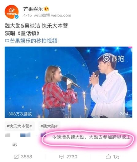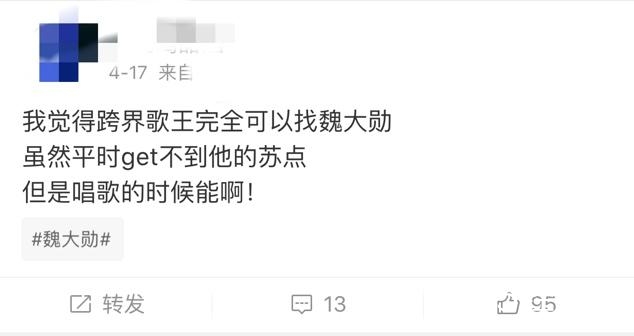 前些天,最近异常活跃的魏大勋因为和鬼鬼的一段合唱登上了微博热搜榜,视频里的魏大勋倒是少了往常的蠢萌,一开嗓也是十分惊艳!不少网友评论说,魏大勋才是真的该登上跨界歌王舞台的人呐!