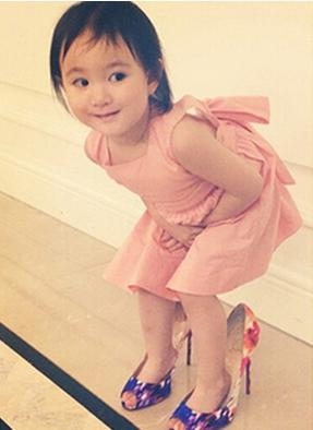 “小萌神”奥莉平常也是爱美的小公主哒,平常喜欢穿妈妈的高跟鞋,一脸张望的样子看起来调皮可爱,弯着腰的样子是怕被妈妈发现吗哈哈~