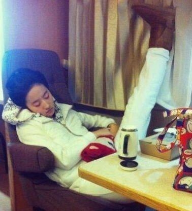 刘亦菲一只脚抬在墙壁上睡,估计睡醒估计要找人求救帮把腿掰下来吧,哈哈。