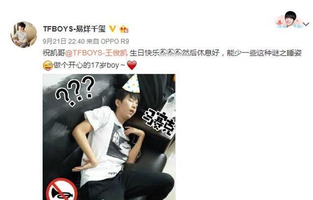 前不久易烊千玺在微博上晒出了一张王俊凯的销魂睡姿照片,并配文“希望大哥能休息好,少一些这样的销魂睡姿”。