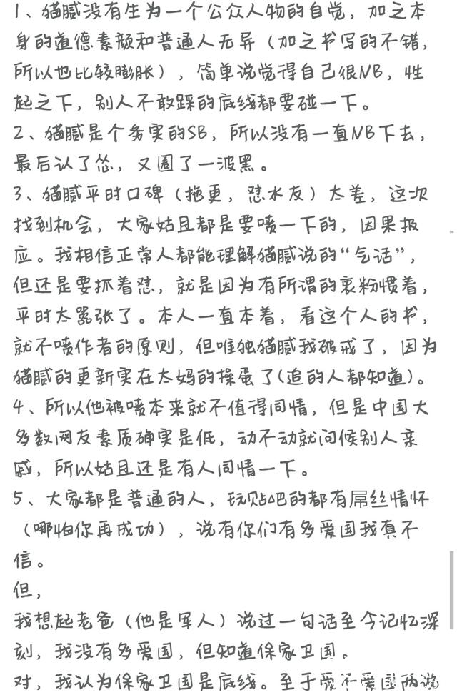 在猫腻的感受和我的感受之间,我选择照顾我的感受,我爽了才最重要,修的就是顺心意!——————说句正经的,一个动辄把cnmb挂在嘴边的作者,一个不分大义说出如此混帐话的作者,一个为钱认怂自我打脸的作者,不把自己的书粉当一回事,反而跪舔棒子,四十岁的人了还能做出这种事,被黑真是活该!