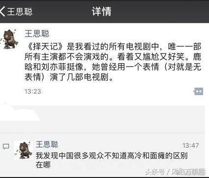《择天记》开播以来,热度蹭蹭的往上增。其中鹿晗的粉丝们功不可没,毕竟中国少女心的人多。但是这部电视剧的反面声音也不小。思聪也发布了看法: