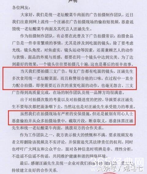 据透露广告拍摄团队称:为了挑拨双方的合作关系,这是故意抹黑汪涵和统一老坛方便面 ,有人恶意偷拍汪涵边吃边吐视频并把其发到网上,断章取义。汪涵经纪人随后也转发该团队所发声明,批驳关于汪涵拍广告不敬业的负面消息。
