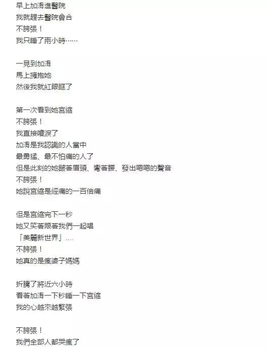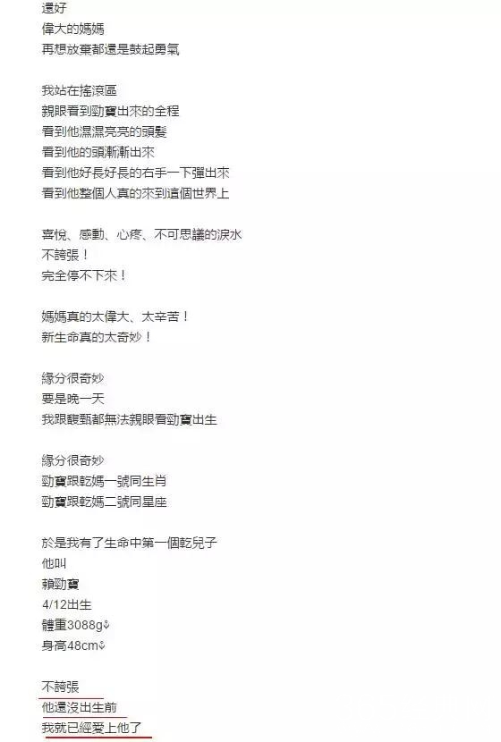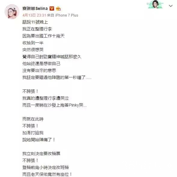 而另一位干妈就显得久久不能平复。陪产后的Selina走出产房,幸福、激动、感恩,五味杂陈的心情在微博里一吐为快。字里行间充满对新生命的宠爱和对好友的心疼、敬畏。