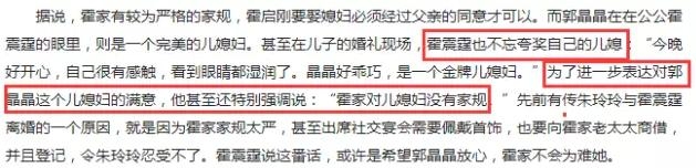 用郭晶晶自己的话来说就是“他是豪门,我是冠军,豪门有很多,冠军没几个。”加上霍家一向支持国家的体育事业,霍启刚娶了晶晶后霍家在体育界的地位就更加稳如泰山了。霍震霆也非常喜欢郭晶晶。