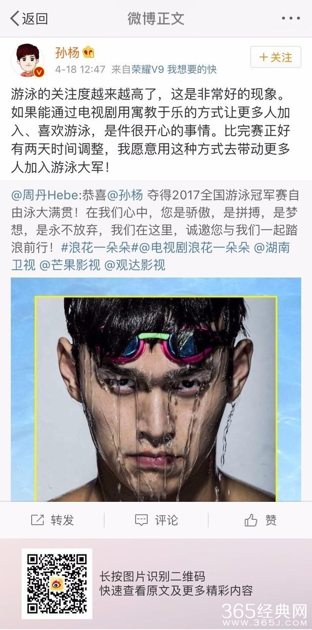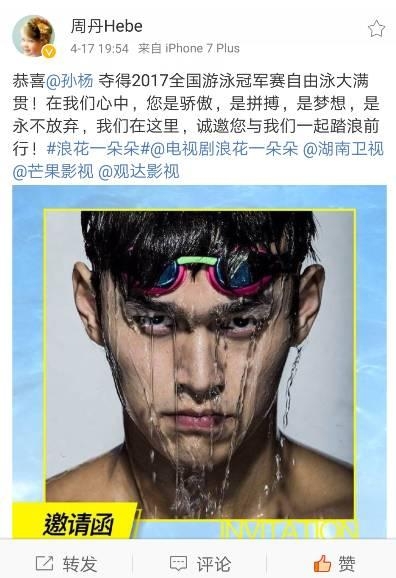 让人振奋的是,在昨日12点多,孙杨转发该微博,并回应邀约:“游泳的关注度越来越高了,这是非常好的现象。如果能通过电视剧用寓教于乐的方式让更多人加入、喜欢游泳,是件很开心的事情。比赛完正好有两天时间调整,我愿意用这种方式去带动更多人加入游泳大军!”这一回应,意味着孙杨将首次以参与电视剧的方式推广游泳,而观众也将在《浪花一朵朵》中见到孙杨亮相。