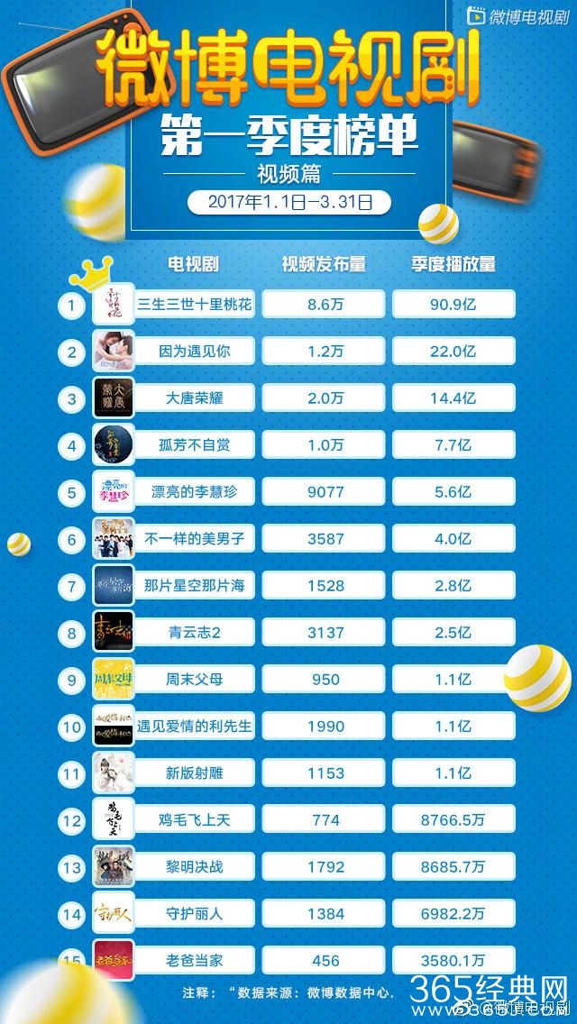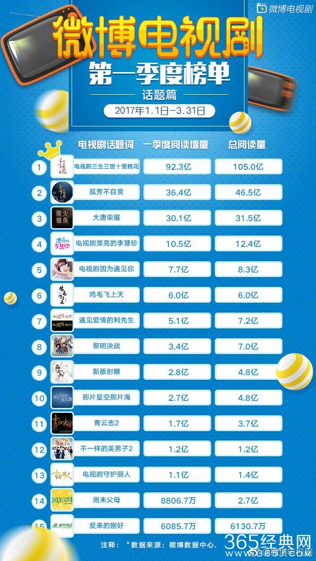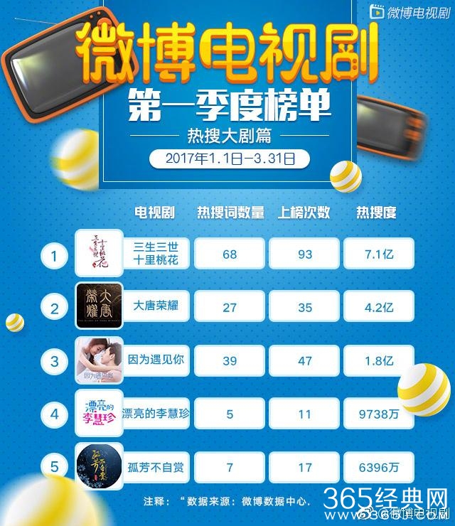 爱豆新闻讯 “微博电视剧季度榜”出炉,从2017年1月1日截止到3月31日,第一季度热搜大剧中热搜词数量、上榜次数、热搜度榜首《电视剧三生三世十里桃花》,第一季度明星角色被提及播放量第一名杨幂,第一季度话题阅读量冠军还是《电视剧三生三世十里桃花》,第一季度视频发布量以及播放量位居最高的依然是《电视剧三生三世十里桃花》,即使是过了这么久,三生的热度依旧不减,大幂幂的人气依旧如此的高,真是厉害了我的幂!