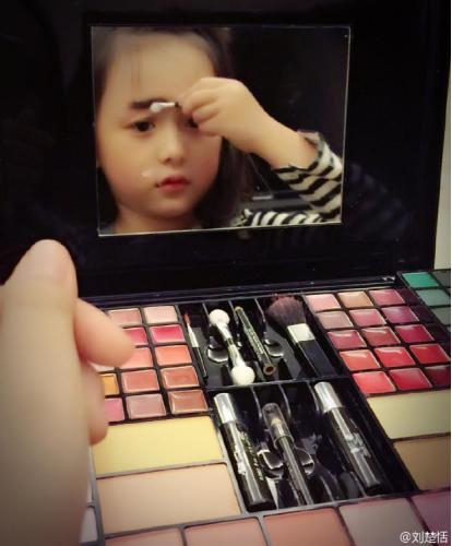 而小楚恬私底下也是个爱美的小姑娘,看看这琳琅满目的化妆品,妹妹有点羡慕呀。不过把自己的眉毛画成蜡笔小新,简直不要太可爱啦~