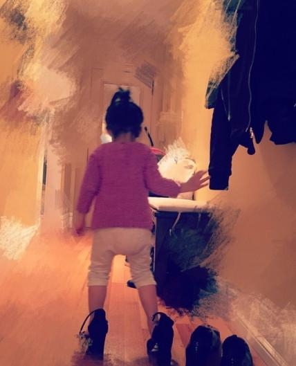 现在的奥莉长大了,头发也长长了许多,穿上妈妈的黑色粗跟高跟鞋,整个人一下子变身酷炫御姐范~说不定奥莉长大了会是个酷妹呢~