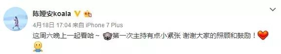 这两天,陈娅安就自己发微博称:第一次主持有点小紧张 谢谢大家的照顾和鼓励!