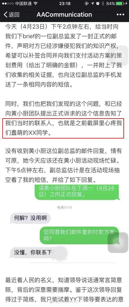 那位联系人的聊天记录在这里,看起来黄磊这边对于之前拒绝他们的方案也有点不好意思的,并且明言对自己现在的合作对象不满意。