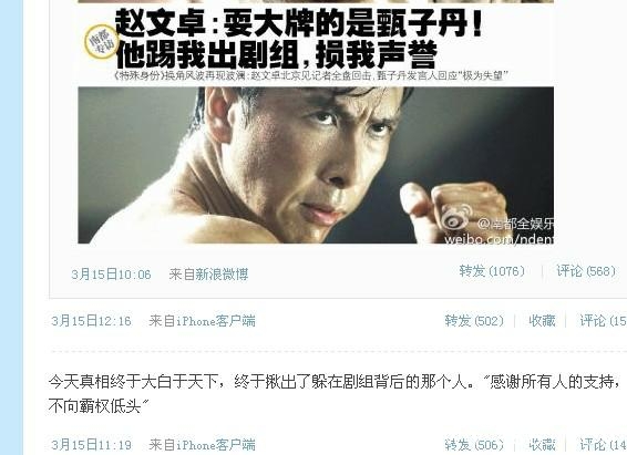 甄子丹却公开回应这不是他的原因,两人互相斗了起来,两人的粉丝也开始公开对骂起来,最夸张的是其他明星也开始加入其中,形成了明星两大派,赵派和甄派。