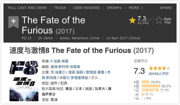 从全球范围来看,《速度与激情8》也毫无疑问是最近难得的票房霸主,据Box Office数据,截至目前它在全球已经收获了超过7.7亿美元的票房。不过这个成绩之中,北美的1.3亿美元仅仅贡献不到五分之一,而中国超过1.9亿美元的票房成绩,继三月的《极限特工3》之后,再次证明融合全明星阵容和火爆大场面这两大元素,在国内电影市场几乎可以无往不利。难得的是,中外观众对这部电影的评价出奇的一致,豆瓣和IMDb评分均为7.3。40句充满正能量的经典励志语录