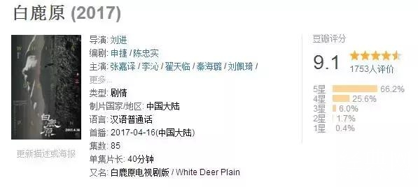 比没有评分更悲惨的,是开播一集就高达9.1分,却被停播的《白鹿原》。