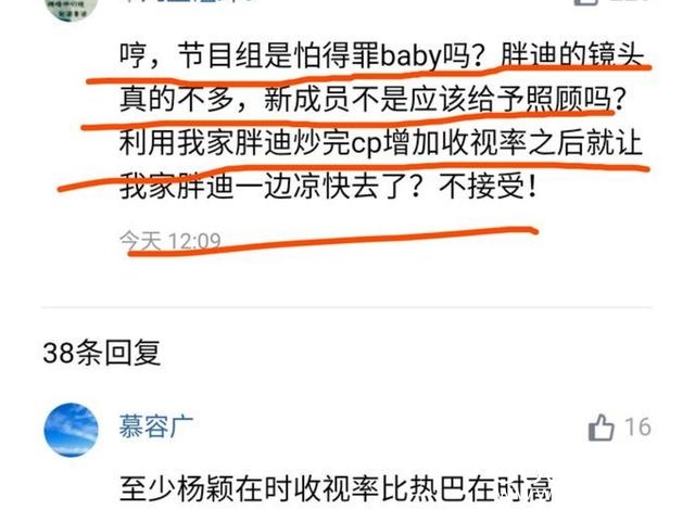 网友评论:”节目组是怕得罪baby吗:胖迪的镜头真的不多,新成员不是应该给予照顾吗?“利用我家胖迪炒完cp增加收视率之后就让胖迪一边凉快去了?不接受。”