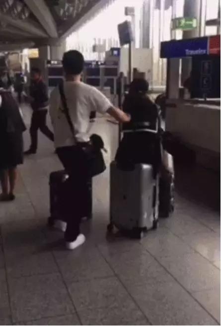 走累了,这两位还会玩心大起,刘诗诗直接坐在行李箱上,让吴奇隆推着走。