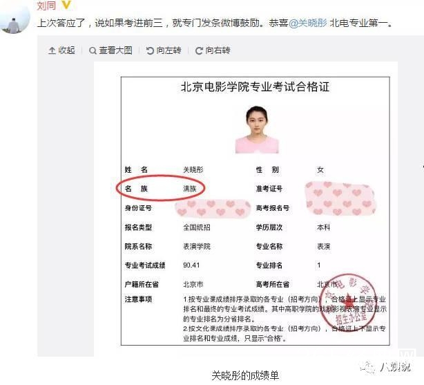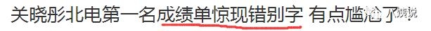 2016年4月14日,光线影业副总裁刘同在微博晒出一张“国民闺女”关晓彤考北电表演系专业课的成绩单。被网友发现关晓彤成绩单上的“民族”打成了“名族”
