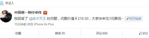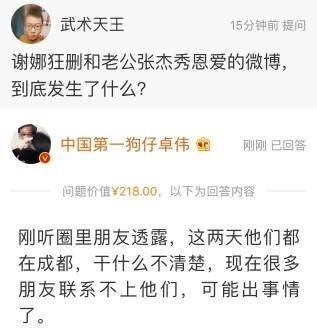 总之,太多不一样的原因版本,在网上风一样的散播。当然,就在散播的同时,有些人还是保持特别理性的。这不,号称在娱乐圈里没有什么事儿不知道的卓伟,就有人花钱问了这样一个问题。