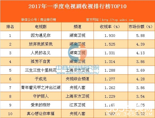 2017年一季度电视剧收视前三分别为:因为遇见你、放弃我抓紧我、人民的名义。另外,从平台来看,收视率前四的电视剧都在湖南卫视播出。