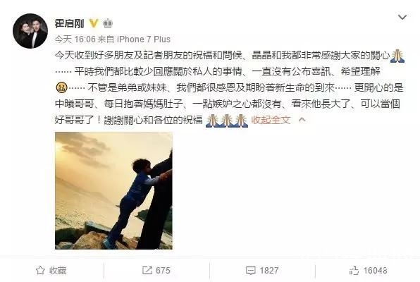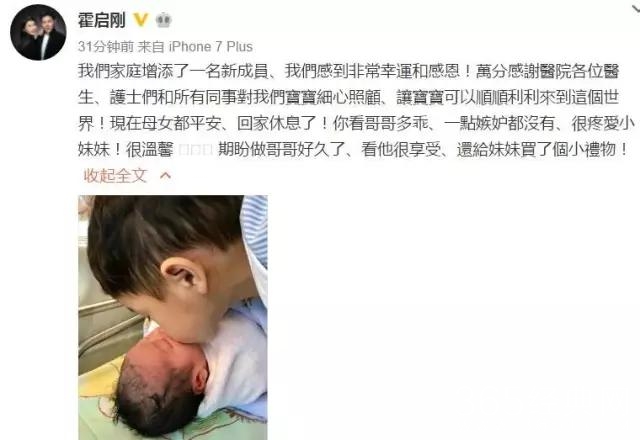 今日中午,霍启刚在微博宣布郭晶晶二胎生下一女!