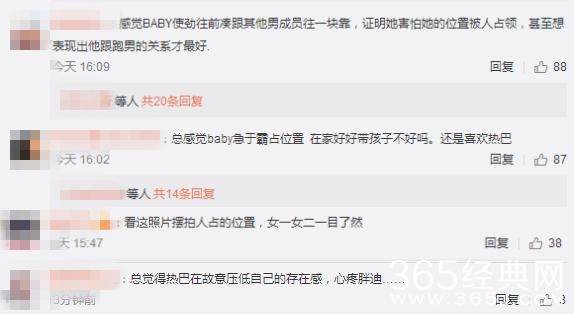 对于邓超今天晒出的照片,网友纷纷留言“感觉BABY使劲往前凑跟其他男成员往一块靠,证明她害怕她的位置被人占领,甚至想表现出他跟跑男的关系才最好.”“总感觉baby急于霸占位置 在家好好带孩子不好吗。还是喜欢热巴”