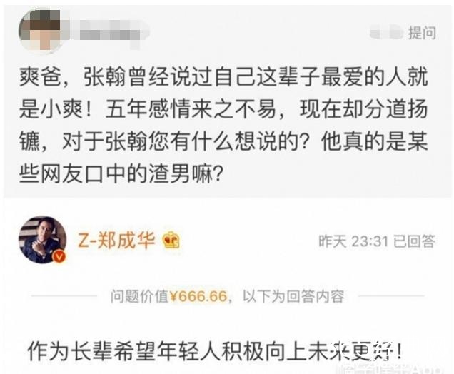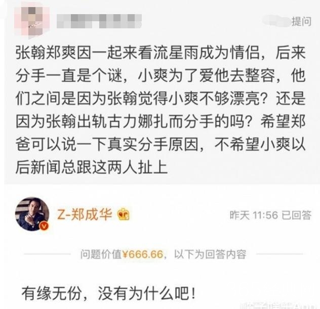 前段时间爽爸在微博中开通了问答功能,被问到关于张翰和郑爽分手的真实原因,爽爸用了四个字回应:有缘无分。这四个字也没有偏袒谁,说白了就是两人是和平分手,不存在谁劈腿。