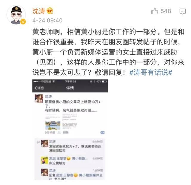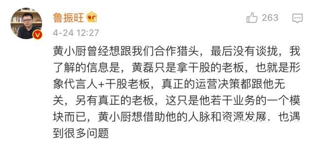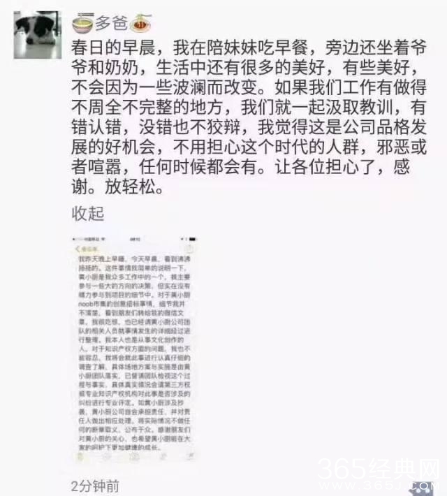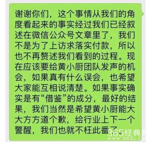 2.我也是吃瓜。 “看到朋友们转给我的微信文章,我很吃惊,也已经请黄小厨公司团队的相关人员就事情发生的详细经过进行整理。”