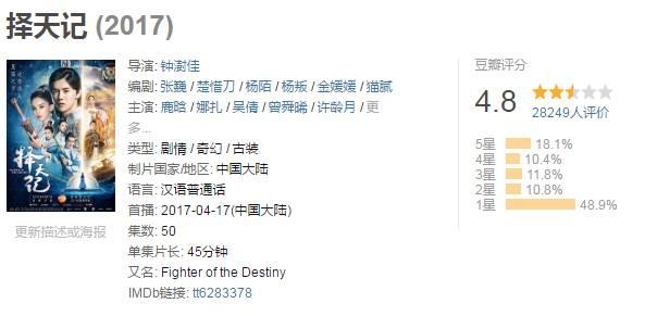 是网络大热的《择天记》两倍的分数都赶不上的。