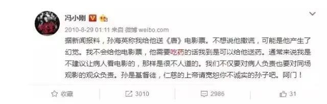 冯小刚跟孙海英的“仇怨”可以说是已经持续了很长时间,由于两个人在影视圈的地位都不低,所以每一次发生冲突都备受关注,孙海英曾经表示从来不看国产电影,冯小刚送给他《唐山大地震》的票,他都没有去看。后来被冯小刚在微博上实力打脸,冯小刚在微博里说孙海英可能需要吃药了,还讽刺孙海英是“孙子”