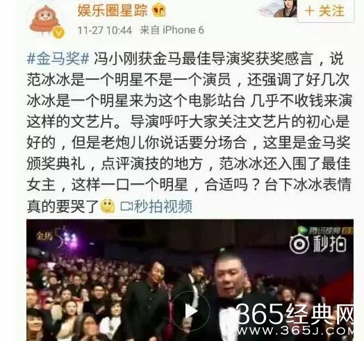 冯小刚因为排片的事与王思聪微博撕逼还可以看成是与“外人”的对战,观众们也能理解,但是冯小刚还得罪了同是一个剧组的范冰冰,《我不是潘金莲》这部电影得了最佳影片奖,冯小刚领奖的时候提到范冰冰,表示“一个明星来演这个电影,冰冰也是很不容易。”一句话说的在台上的范冰冰很难堪,也引起了很多人的不满。