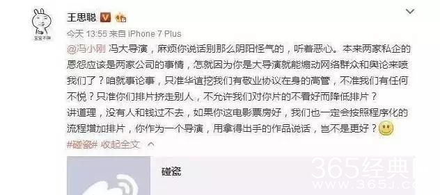 说起冯小刚最近一部有争议的电影,大多数人都会想到《我不是潘金莲》,这部电影上映之后,冯小刚及华谊老总直接在微博上炮轰了万达总裁王健林,还引发了与王思聪的一场口水大战,这场口水战可以概括成:冯小刚不满万达对《我不是潘金莲》的排片太低,而且是因为私人恩怨导致排片低,而王思聪讽刺冯小刚拍的片子并没有那么好。