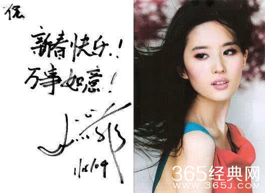 看得出来刘亦菲为了练自己名字没少下工夫。赠言和签名简直千差万别,而签名也几乎认不出。
