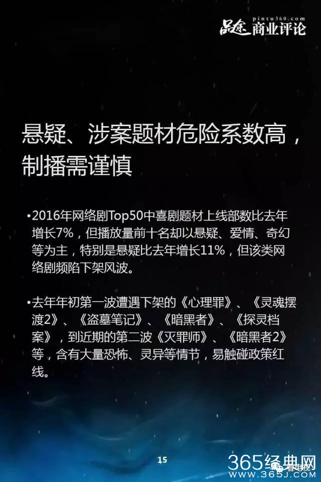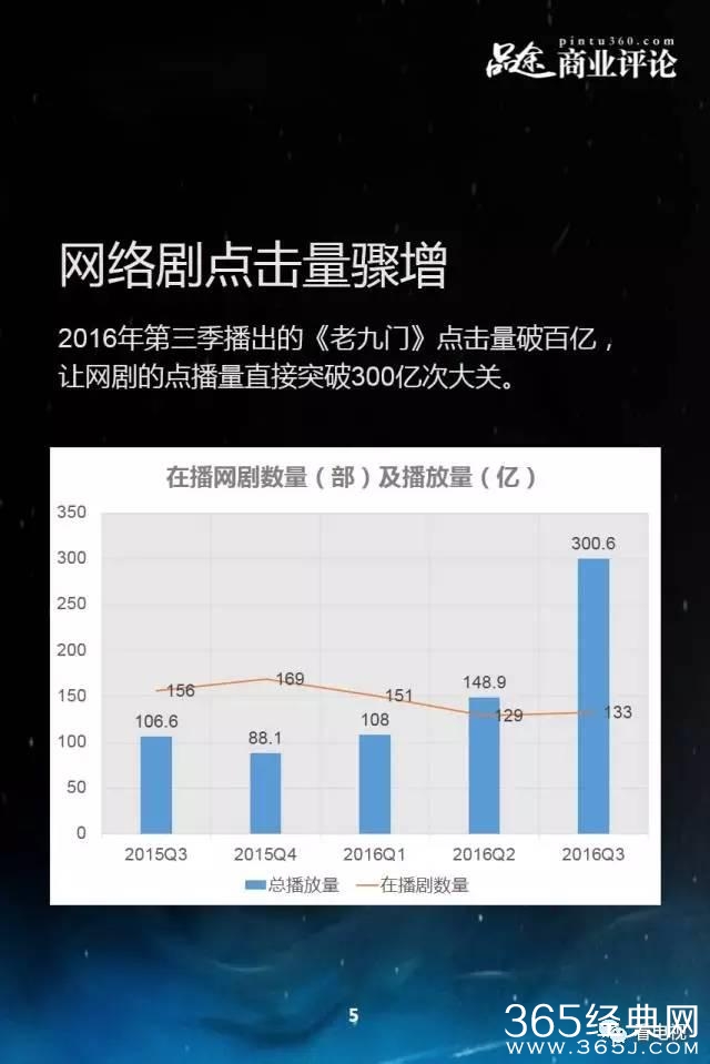 2016年,是网络剧从“搏量”走向“拼质”的转折点,2016年网络剧产量总时长突破12万分钟,达到近5000集。去年第三季播出的《老九门》点击量破百亿,网剧的点播量直接突破300亿次大关。