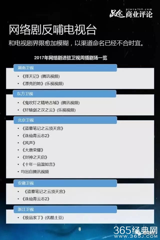 此前难登大雅之堂的网络剧不再是粗制滥造的代名词,开始反哺电视台,不完全统计,2017年将有十三部剧进入卫视周播剧场。成本也从开始的单集不到五万元,到如今《盗墓笔记》单集成本548万。