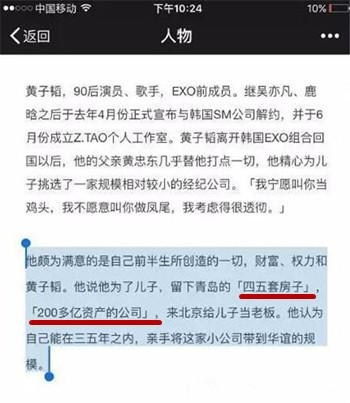 而他之所以这么有钱,一方面是他自己赚的,更重要的是他有了富豪爸爸,他背景极深富豪爸爸黄忠东身价超200亿,青岛富豪第七名,不得不佩服黄子韬出道这么久一直装穷,绝对不是零演技。