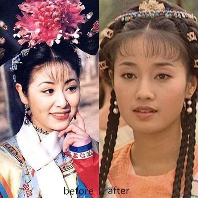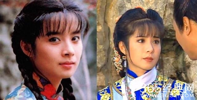 (岳翎在琼瑶剧中角色的剧照,左为1992年《青青河边草》的杜青青,右为1994年《新月格格》中的新月