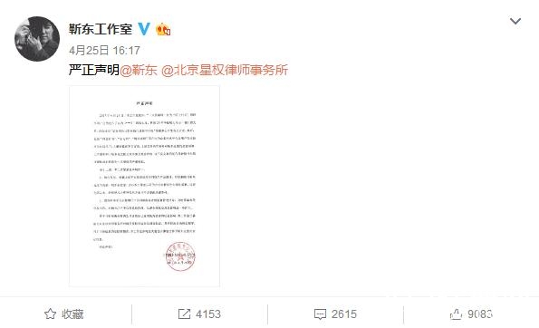 可是昨天靳东工作室却突然发了一封声明,表示网上曝出的《xxx停工痛彻心扉,靳东25年辛勤努力功亏一篑》的文章,内容涉及“某女演员与靳东拍片过程中开房”等诸多言论,纯属子虚乌有,都是恶意诽谤,要求各大媒体停止转载发布不实信息,减少对靳东名誉的影响。