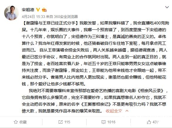 但前两天,宋祖德在微博爆料指王菲与谢霆锋已经协议分手,直言两人在一起真正目的就是为了捞金,还许下豪言说如果消息有误的话,就会“直播吃400克狗屎”!