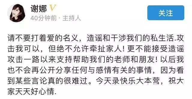 在舆论闹的一锅粥的时候,谢娜终于站出来回应了。表示以后不会再公开分享任何与感情有关的事情,因为看到某些言论真的很难过。
