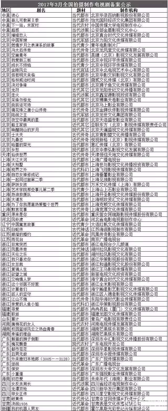 总局公布2017年3月全国拍摄制作电视剧备案公示的通知。通知显示,2017年3月,全国电视剧拍摄制作备案公示的剧目共80部、3421集。