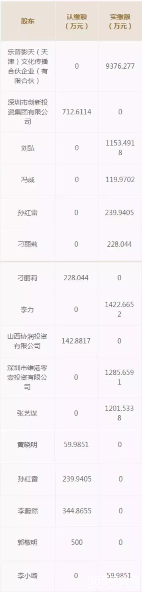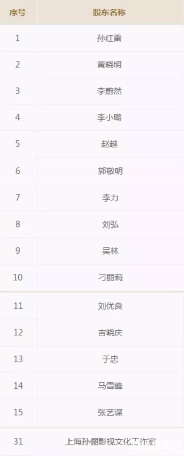 可以看到,孙红雷、黄晓明、李小璐、郭敬明、张艺谋、孙俪的名字都赫然出现在这份长长的股东名单里。