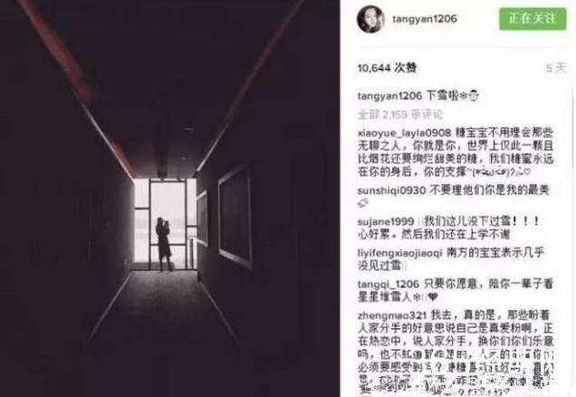 但近日因为唐嫣的一张照片而被劝分手。在糖糖的ins上,糖糖发了一张灰白色照片,照片中的糖糖 一个人站着在一条幽深的走廊尽头,像是在拿着手机拍照一样。并配文:下雪啦!40句充满正能量的经典励志语录