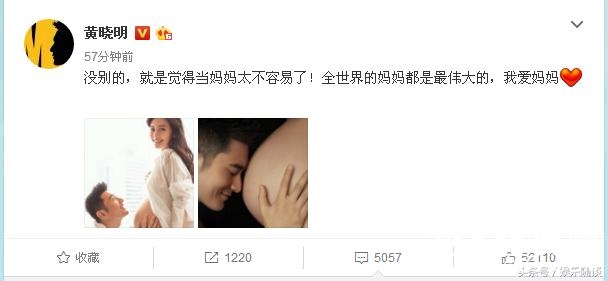 虽然是工作室予以澄清,但是并没有拿出实质性的证明。有些网友去却急了,拿出了一些baby的孕照。但却被质疑有涉嫌造假。但今天黄晓明却在微博上晒出了,baby的孕照。并说:没别的,就是觉得当妈妈太不容易了,全世界的妈妈都是最伟大的,我爱妈妈。