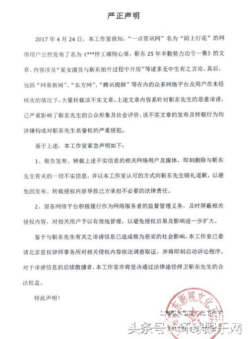 近日,网上曝出了《白百何停工痛彻心扉,靳东25年辛勤努力功亏一篑》的文章,内容涉及“某女演员与靳东拍片过程中开房”等诸多言论,对于此事,靳东工作室昨天下午发布了声明,表示此文章是恶意诽谤,要求各大媒体停止转载发布不实信息,减少对靳东名誉的影响。