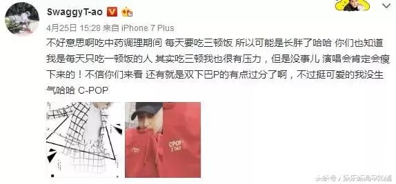 他自己也发微博了,说明现在正在吃中药调理,是有胖一点,不过演唱会前就会减下去。还点名P图的人,调侃双下巴过分了,不过还挺可爱的。