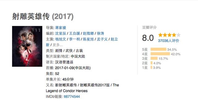 这份数据中,另外一个让人意外的,则是新版“射雕”的利润率居然比“三生三世”还要高。今年初,没有大明星参与的新版《射雕英雄传》低调播出,但精良的制作、演员扎实的表演,让该剧口碑迅速攀升,豆瓣评分达到了惊人的8.0!要知道,全民热追的口碑大剧《人民的名义》,豆瓣评分也才8.5啊。