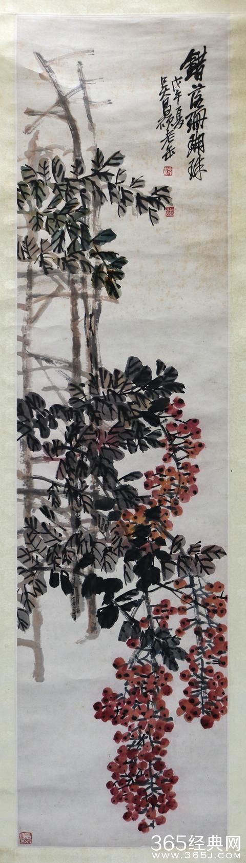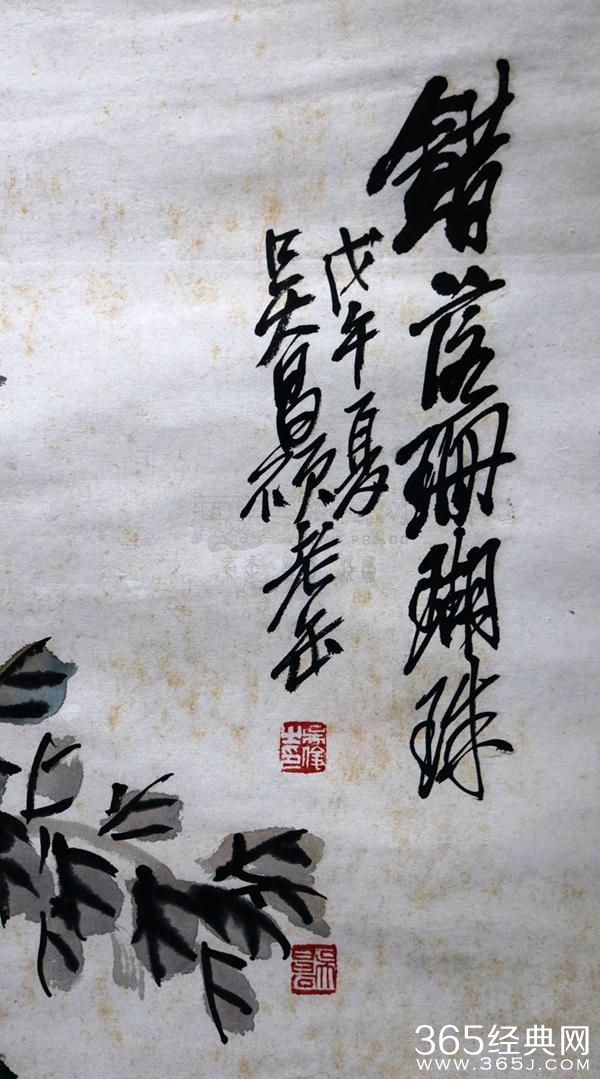 吴昌硕的画鉴定方面总体来讲 ,第一,先从材质鉴定学讲,吴昌硕的真画,用的墨一定是油烟墨。就是从画的背后看他都有油浸。潮湿地方的油浸发淡咖啡色,不潮湿地方的油浸泛淡墨绿色,一定是油烟墨写的或画的。第二他那写的字,大气、苍茫、古拙、飘逸、厚重,每一个笔画都有涩的感觉,有力透纸背的感觉,假的都不行。他是以书法入画,所以看他的画真假就是从书法的角度来看,一个从墨的角度来看,凡是用的红色如果不是西洋红那就有问题了,就有可能是假的。他的印章都是自己刻的,如果和印谱里的印章对不上就是假的。从早期中期晚期他都没有用过别人的印章。(那他常用的有哪些印章)那他多了,比如常用的“俊卿之印,吴俊之印,吴昌石”这都是常用的章,“俊卿之印,昌硕”这都是名章,另外比如闲章“大聋”等。