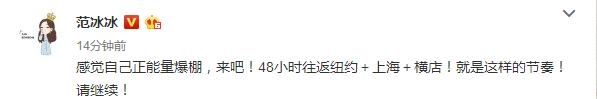 “感觉自己正能量爆棚,来吧!48小时往返纽约,上海,横店,就是这样的节奏,请继续。”看起来范冰冰是真的太忙。琢磨一下,范冰冰这是话里有话。感觉自己正能量爆棚,是不是暗批那小号里的内容和网友的批评谩骂都是负能量呢?说自己忙,不就是表明态度,有正事要做,没有功夫理会那些乱七八糟的事。这样的态度很范爷。外界怎么评价是你们的事,我只做好自己的事情。