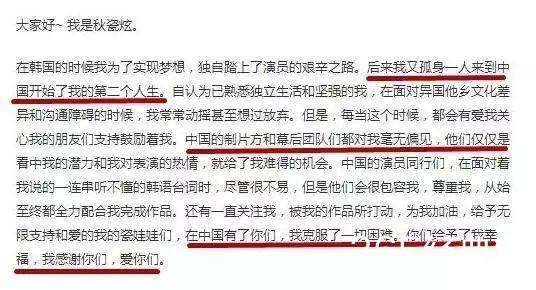 在中国,秋瓷炫体验到了很多在韩国感受不到的关爱,希望她在中国生活的幸福快乐。